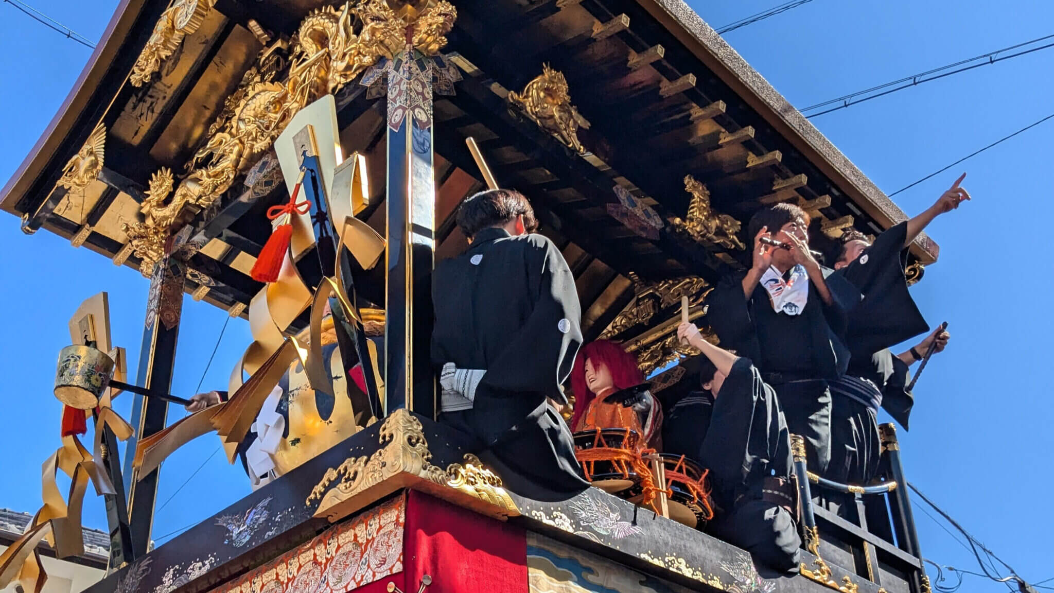 本祭は、曳山が丸一日をかけて街中を巡行しながら、各所でからくり人形とお囃子を演じ、曳山のうえからちまきなどをふるまわれます。