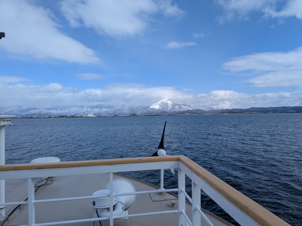 雪がちらついているときや船がスピードを出して走行しているときはさすがに寒いのですが、コート着込んででもデッキを体験されることをおススメします。