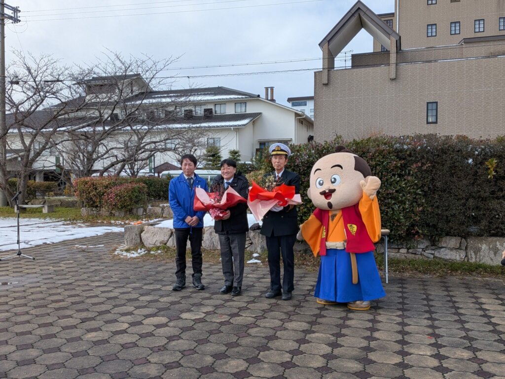 長浜港では、雪見船就航の歓迎セレモニーとして、長浜観光協会のみなさまと「ひでよしくん」が温かく迎えてくれました。