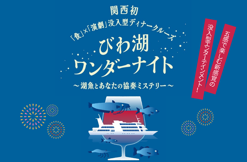 琵琶湖汽船株式会社(本社:滋賀県大津市浜大津、代表取締役社長:金澤 一徳)は株式会社 Alave(本社:東京都文京区、代表取締役社長:小濱 晋)と共同で、2026 年 2 月に、関西初となる“食”と“演劇”が融合した没入型ディナークルーズ「びわ湖ワンダーナイト~湖魚とあなたの協奏ミステリー~」の予約受付を開始いたします。