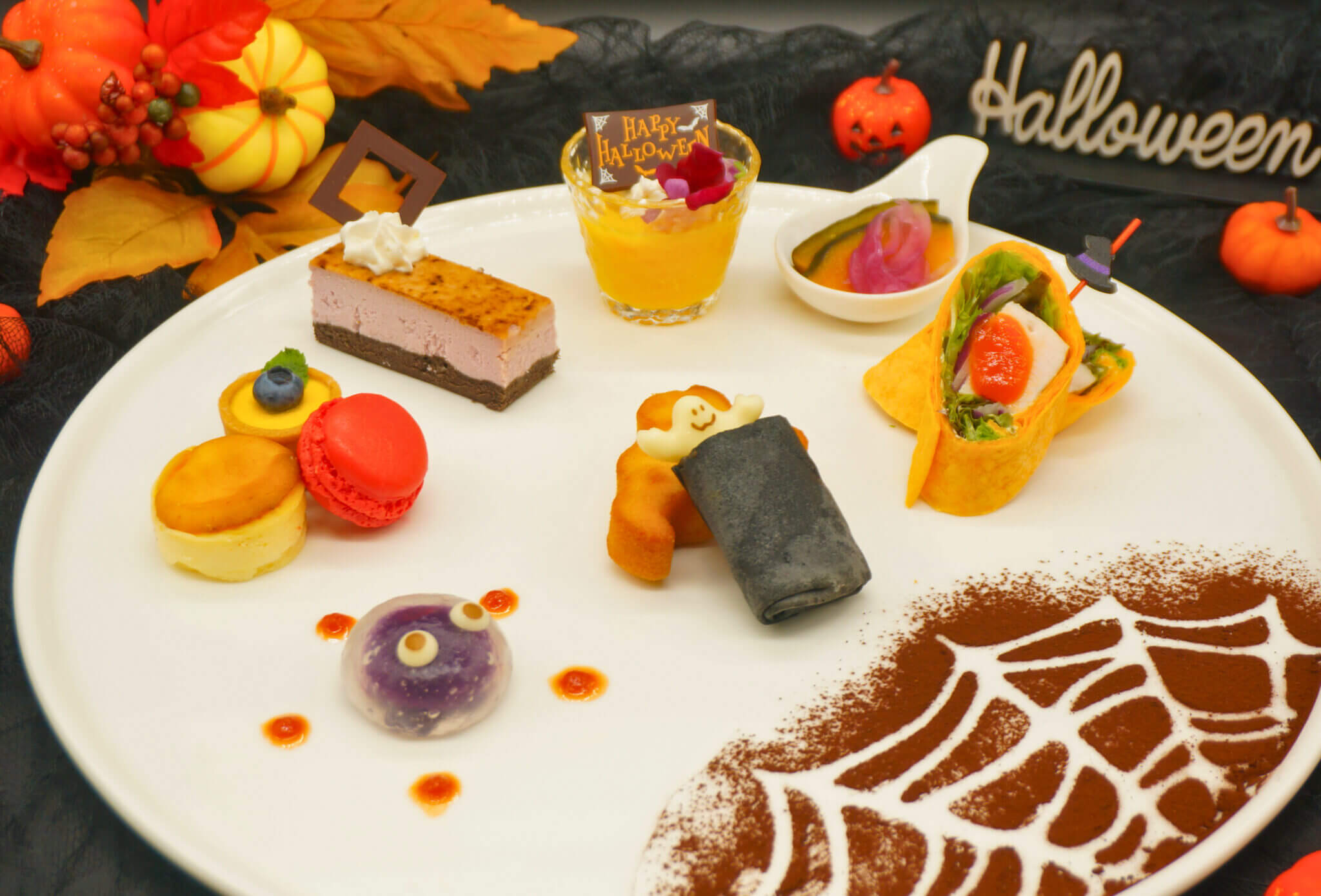 かぼちゃやさつまいもなど秋の味覚を使用したスイーツに、ハロウィンの飾りを添えてかわいらしく仕上げました。