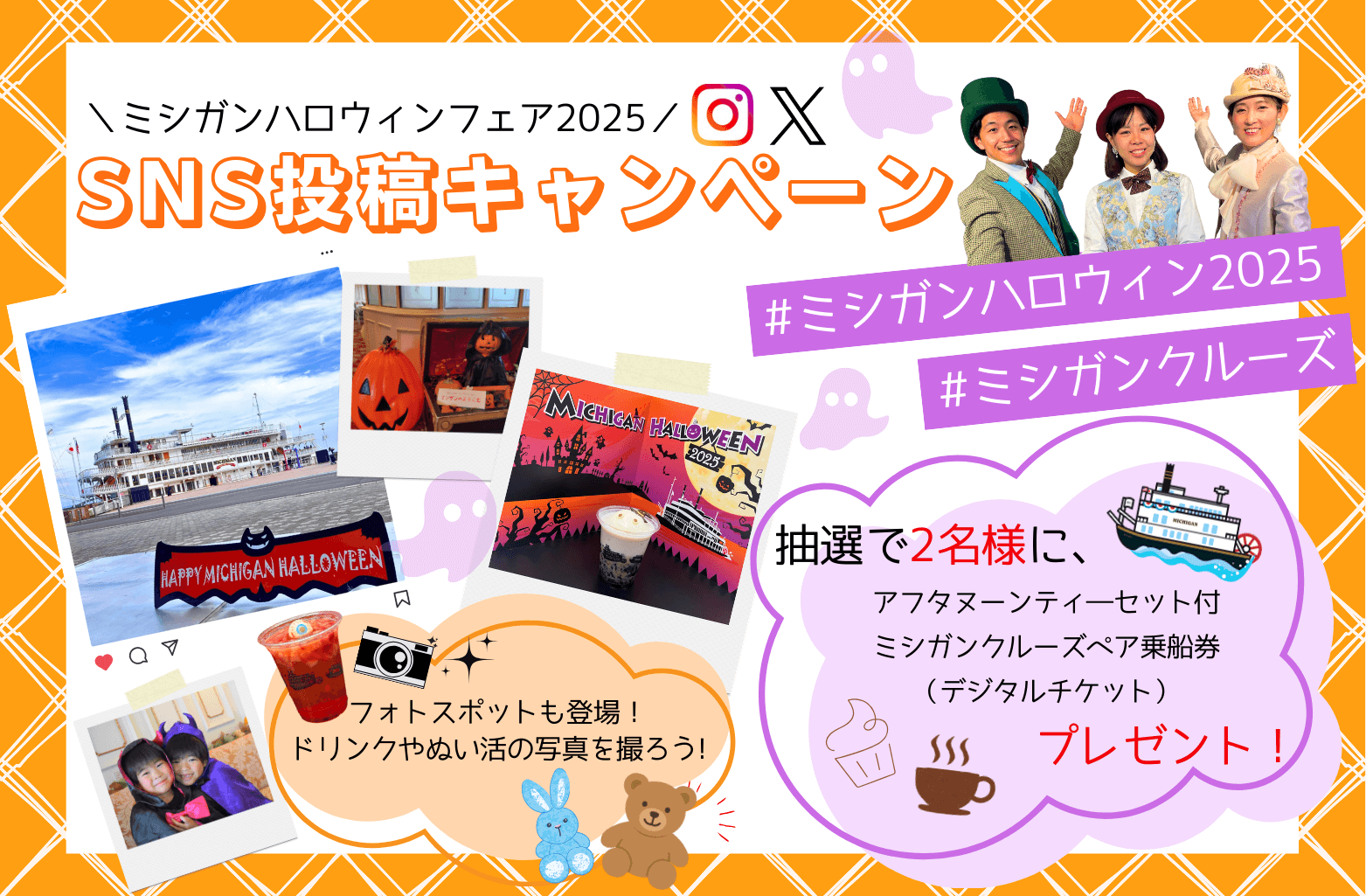 ハッシュタグ「#ミシガンハロウィン2025」「#ミシガンクルーズ」をつけてミシガンクルーズに乗船した際の画像をInstagramまたはXに投稿しよう!