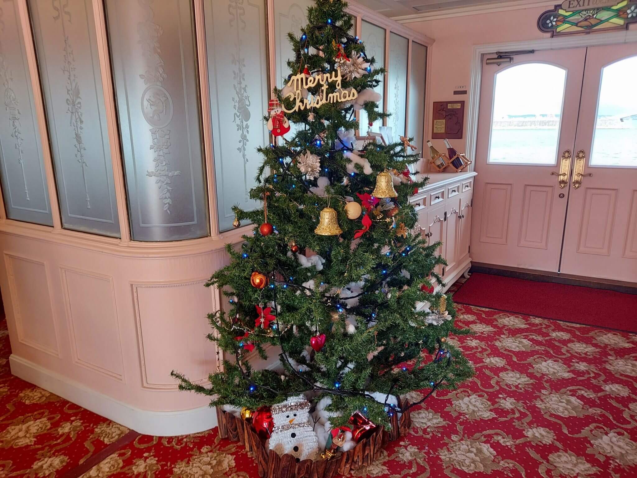 大津港構内、船内レストランや見学室がクリスマスツリーやモチーフで華やかに!