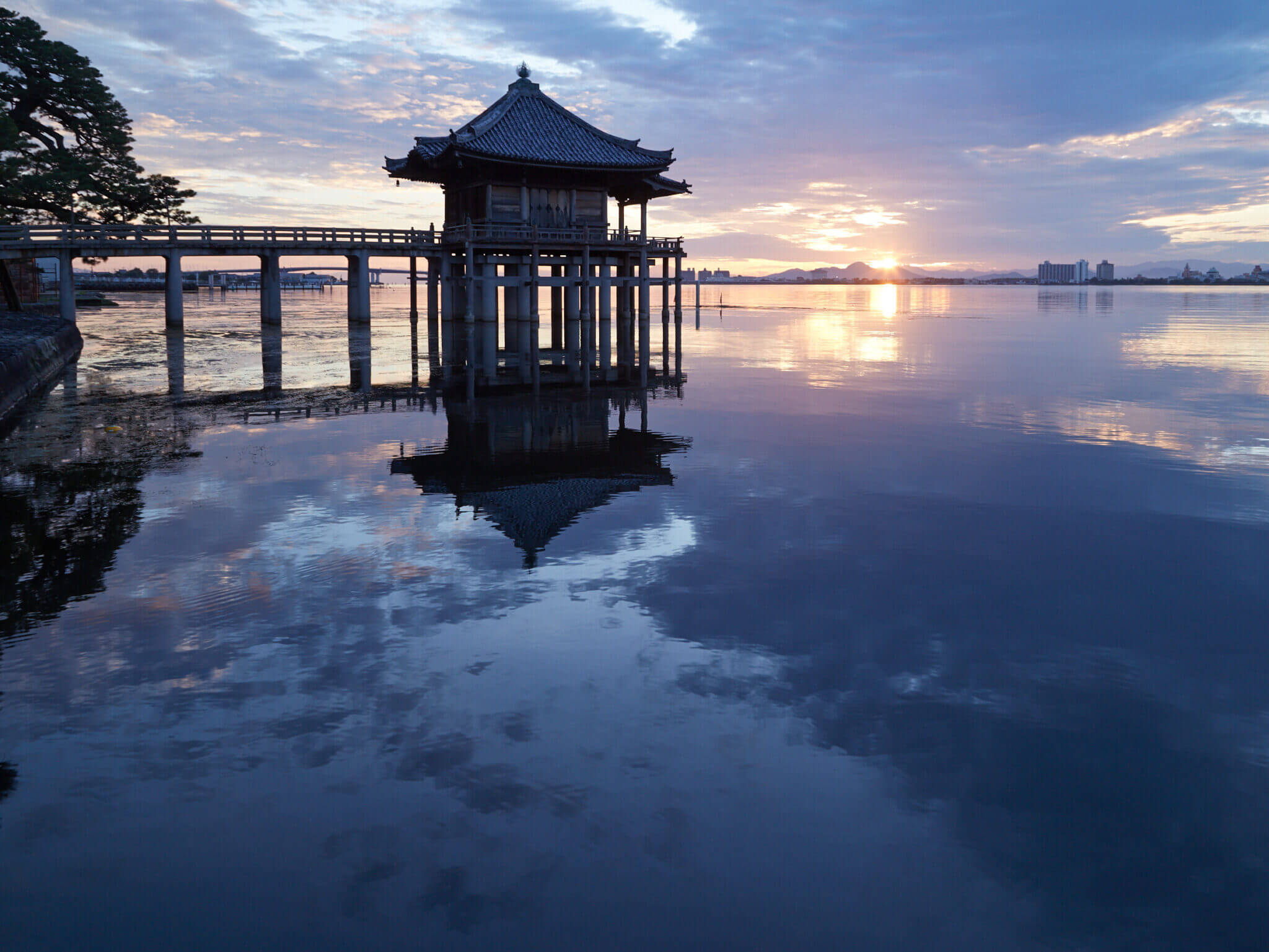 魚清楼は、浮御堂近くで創業から300年近く営まれてきた老舗料理旅館。窓のすぐ外には浮御堂、びわ湖の対岸には「近江富士」と呼ばれる三上山を眺望できる、絶景のお食事処です。