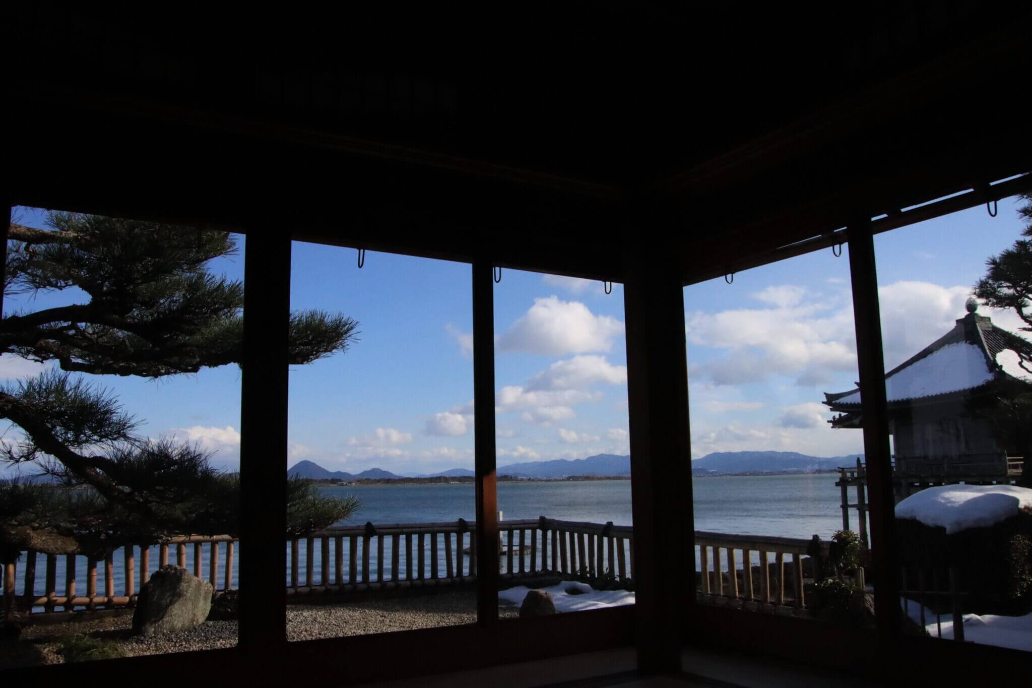 近江八景のひとつに「堅田落雁」があります。冬、堅田の浮御堂に向かって水鳥が舞い降りる夕暮れの景です。この浮御堂、どこからみても風情のある建物なのですが、最高の観望ポイントのひとつが、浮御堂近くにある老舗料亭「魚清楼」の二階座敷から見た景色です。