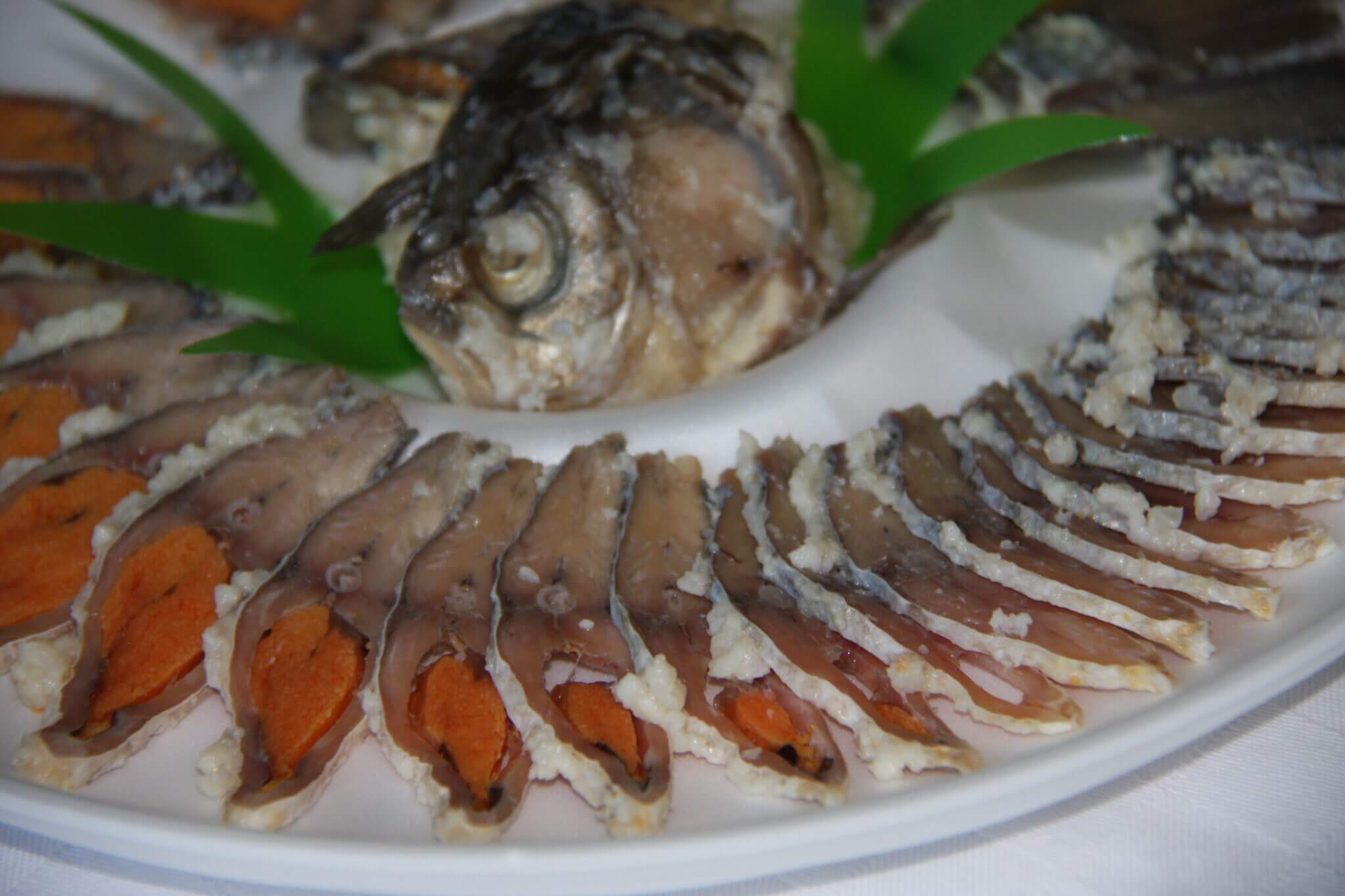 フナズシは、びわ湖でとれるニゴロブナを塩漬けし、白飯で漬けて発酵させてつくられます。「現存する最古の寿司」ともいわれていて、滋賀県を代表する郷土料理で、滋賀県の無形民族文化財でもあります。