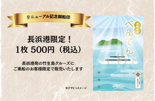 ・「べんてんリニューアル記念デザイン御船印」は、長浜港発の定期船(竹生島クルーズ)にご乗船のお客様限定で販売いたします。御船印のみの購入はできません。
